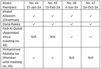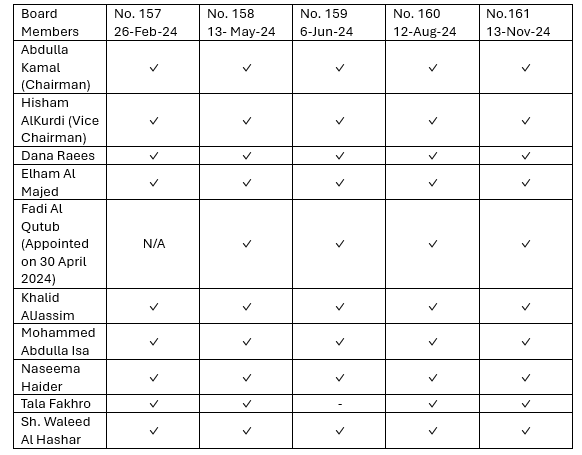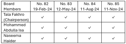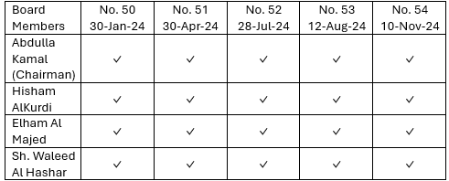 According to the Bahrain Commercial Companies Law and CBB rules, Board meetings will be conducted at least four times a year on a quarterly basis. All Board members must attend at least 75% of all Board meetings within a calendar year. At least 50% of the Directors must attend each Board meeting, including the Chairman or the Vice-Chairman. During 2024, five Board meetings were held in Bahrain, and members’ attendance is noted in the table below: